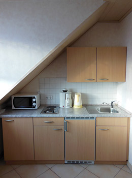 Kochplatte, Kühlschrank mit Gefrierfach, Kaffemaschine, Wasserkocher, Toaster, Mixstab, Rührgerät, verschiedene Gläser und Schüsseln, Geschirr, Besteck und Töpfe