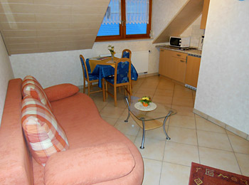 Die Wohnküche in unserer Ferienwohnung mit gemütlicher Sitzecke und Schlafcouch
